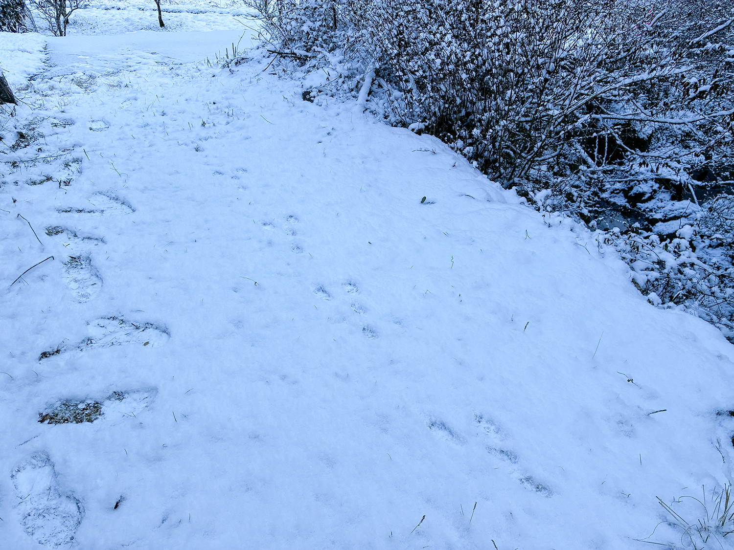 途中で動物の足跡。最初4つの足跡が1つに見えて驚きましたが、この足跡はたぶんうさぎかな?