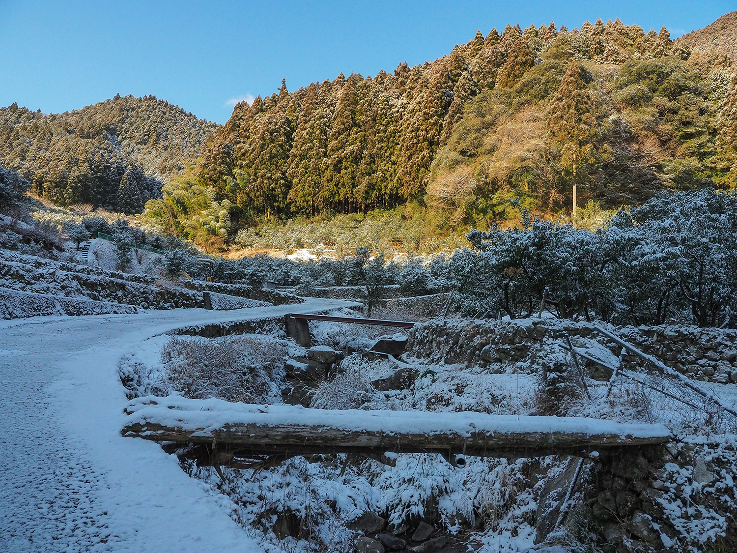 朝方のゆず畑は一面が白く染まり、普段とはまったく違う景色の中を歩くことに。