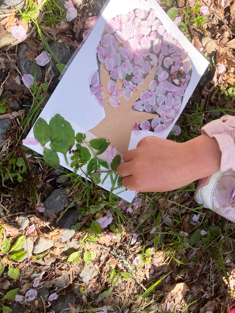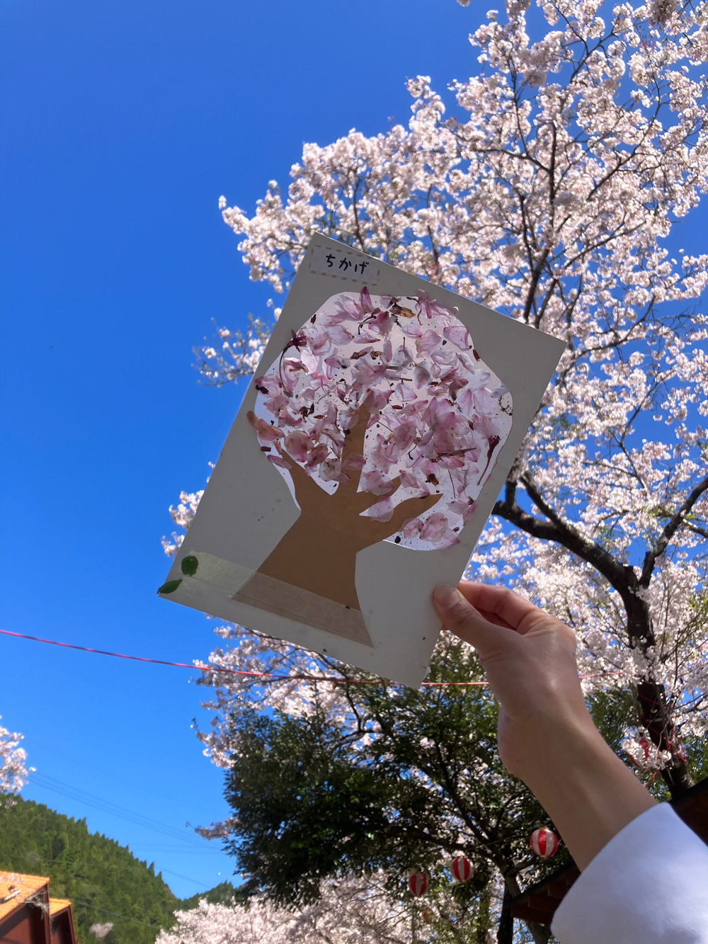 桜もずいぶん花吹雪で散った頃、 ゆずの森の桜の下で熱心に花びらを集めている馬路っ子たちに出会いました。