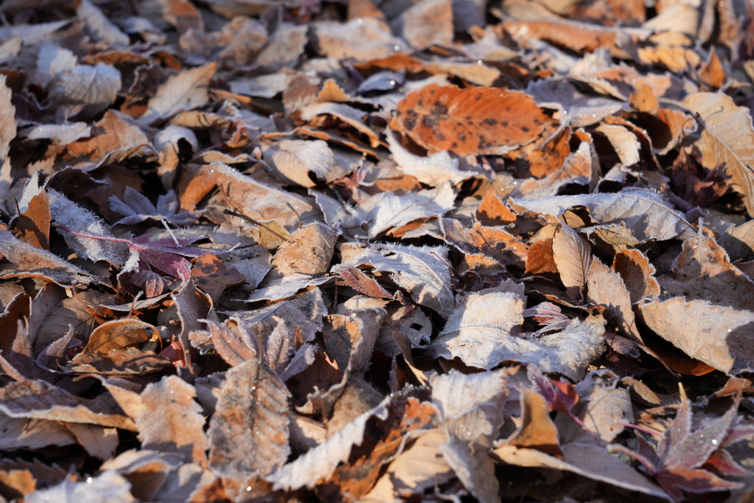 霜をかぶった落ち葉に、やわらかく日が当たりはじめると