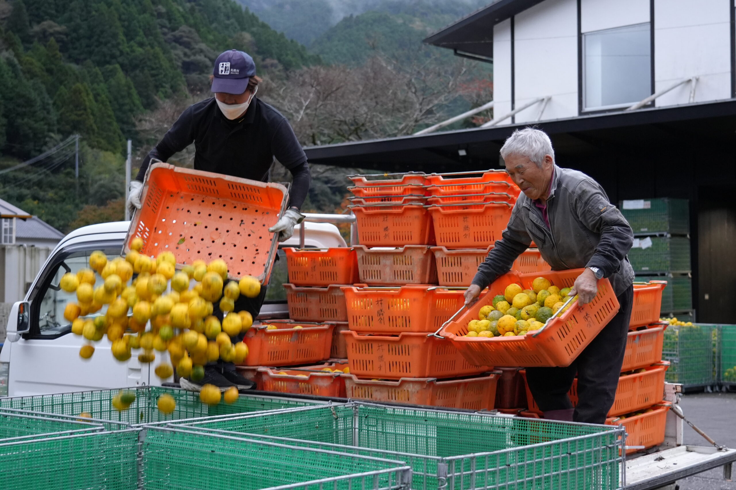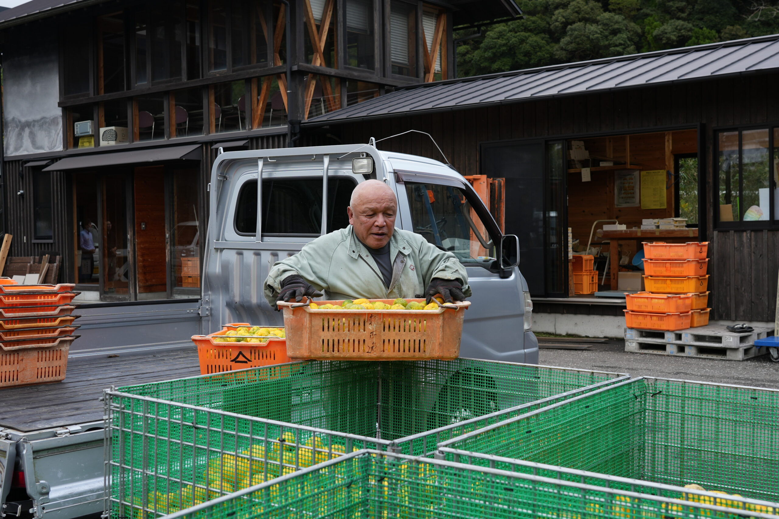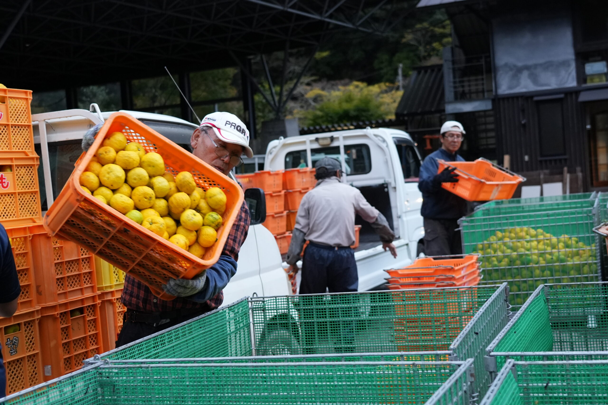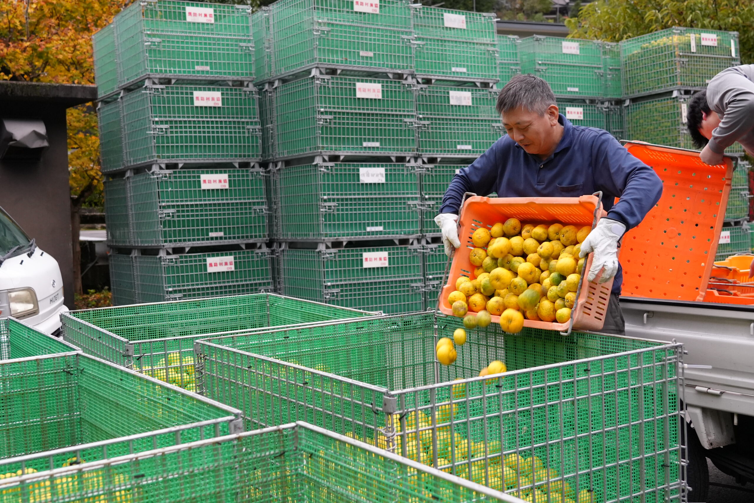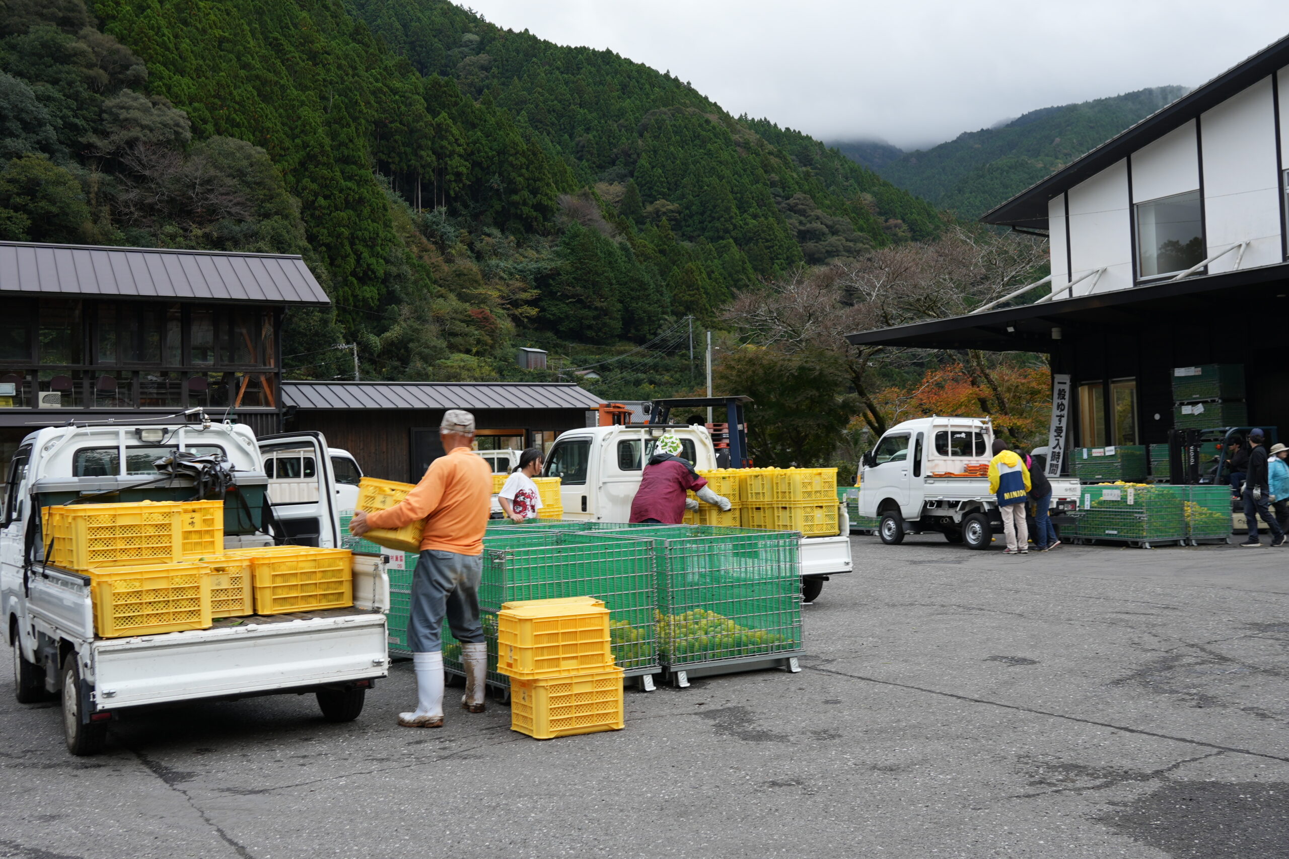 収穫もピークを迎え、日曜日の夕方4時頃の集荷場は 季節限定の軽トララッシュ。 渋滞の列は集荷場の外まで続くほどに。 畑からゆずをたくさんつんだ軽トラが一斉に集まってきたので集荷場は大忙し。 ゆずの収穫もラストスパートを迎えています。