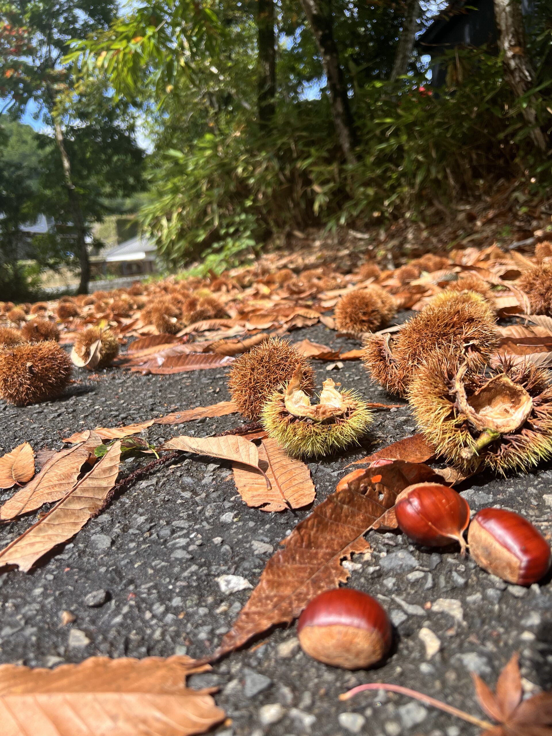 農協の従業員駐車場にある栗が拾い頃を迎えました。 少し前まで緑色だったイガが あっという間に色を変えて 秋の訪れを感じさせます。